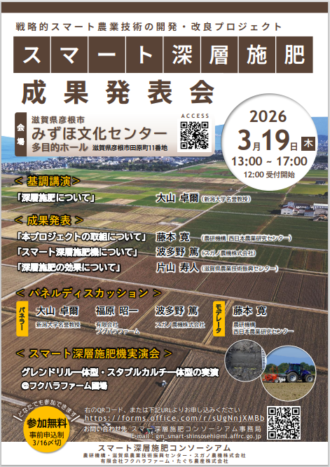 3月19日(木)に滋賀県彦根市で開催予定の戦略的スマート農業技術の開発・改良プロジェクト「スマート深層施肥成果発表会」をご案内いたします。発表会(室内)では、スガノ農機株式会社、滋賀県、現地生産者、農研機構で令和5年度より取り組んでまいりました当該プロジェクトの成果紹介、及びパネルディスカッションを予定しております。その後、会場近くの生産者圃場において、本プロジェクトで開発したスマート深層施肥機の実演を見学いただきます。