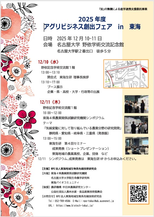 『2025年度アグリビジネス創出フェア  in  東海』を開催いたします。開催日時・プログラ